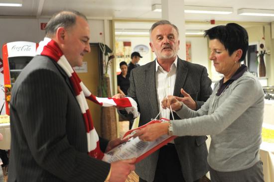 Anlässlich des 50. Geburtstages überreichten Fanclub-Präsident Bernd Hofmann und seine Frau Vroni Fanschal, Wimpel und Urkunde mit Mitgliedsausweis.