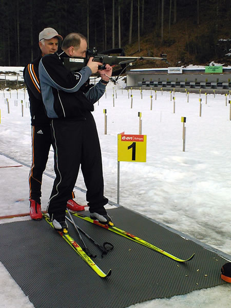 Das war ein unglaubliches Erlebnis. Fritz hat sich für mich Zeit genommen und mir eine Einzelbetreuung gegeben. Nur meine Frau war noch zum Fotografieren dabei, sonst niemand. Ich bin mit Fritz über die Loipe gesaust, habe einige Tipps bekommen, etwa wie man eine Abfahrt sauber hinunter fährt, wie man beschleunigt, wie man sich elegant auf den Langlaufskiern hält, und wurde ins Schießen eingewiesen. Ich habe sogar einen richtigen kleinen Biathlonwettkampf gemacht, ganz alleine. Zwei Stunden hat all das gedauert.