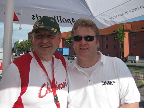 Foto: Die Moderatoren Armin Wolf und Olaf Deistler, Bild:Charivari Um Punkt 19 Uhr fällt der Startschuss, Center-Manager Olaf Deistler wünscht gutes Gelingen. Die Masse setzt sich in Bewegung, schon schnellen die ersten vor. Doch bis alle die Startlinie überschritten haben, vergehen mehrere Minuten. Das Publikum fiebert von den Banden aus mit. An der Galgenbergbrücke vorbei, durch die Maximilianstraße und den Stadtpark, mündet die Menge in die Bahnhofsstraße ein. Über die Kumpfmühler Brücke laufend, bewegt sie sich allmählich in die Zielgerade, die Friedenstraße. Olaf Deistler und Armin Wolf spähen dem ersten Läufer entgegen: Es ist Matthias Ewender vom Team Lindner AG. Nach genau 17:43 Minuten passiert er schwitzend und jubelnd die Ziellinie. Bei der anschließenden Siegerehrung gibt es noch weitere Gewinner: Sowohl bei den Frauen als auch den Männern schneidet das Team der Medicus Leistungsdiagnostik am Besten ab. Die größte Gruppierung bildet erneut die Uniklinik: 207 machten mit.