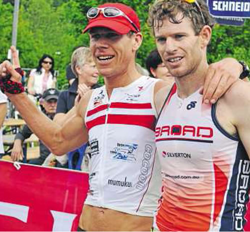 Foto: Der Regensburger Ralf Preissl (li.) konnte auf der Kurzstrecke den Australier Raf Baugh bis zuletzt auf Distanz halten. Foto: Mittelbayerische Erstmals wurde auch eine ganz kurz Jedermann-Distanz mit zwei Fünf-Kilometer-Laufstrecken und einer Radrunde über 17 Kilometer angeboten. Hier hatte der Kelheimer Thomas Stadler