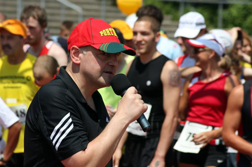 Sportmoderator Armin Wolf heizte übers Mikrofon die Stimmung an und sorgte dafür, dass kein Läufer ohne Applaus die Ziellinie passieren musste. Der Erlös des 5. Commerzbank Charity Stadtlaufs geht an Charivari Einzelschicksale, womit Bedürftige aus der Region unterstützt werden.