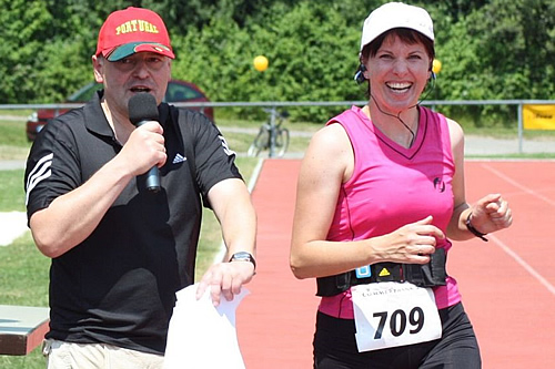 Foto: Ernst SchoberInsgesamt 161 Hobby- und Hauptläufer bahnten sich zur Mittagszeit bei hochsommerlichen Temperaturen ihren Weg vom Sepp-Simon-Stadion in die Innenstadt. Die 5500 beziehungsweise 11 000 Meter waren bei diesen Bedingungen eine echte Herausforderung. Dennoch gaben nur vereinzelt Läufer auf, die meisten wussten mit der Hitze umzugehen und schafften es erschöpft aber glücklich ins Ziel. Eine großartige Leistung, für die sie im Stadion mit dem gebührenden Applaus belohnt wurden. Der schnellste Hauptläufer, Peter Simon aus Ammerthal, brauchte für die Strecke nur 41:16,2 Minuten.