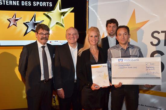 Die Sterne des Sports sind eine Auszeichnung des DOSB und der Volksbanken-Raiffeisenbanken. Damit soll die ehrenamtliche Arbeit in Vereinen gewürdigt werden. Auf regionaler Ebene wurden jetzt am Mittwoch (28.10.2015) in der Regensburger Donauarena die Preisträger ausgezeichnet. Zum ersten Mal wurde ein "Sonderpreis Regional" ausgelobt. Den konnte man auch als Nichtverein gewinnen. Die Bewerbung des Armin Wolf Laufteams hat die Jury überzeugt! 700 Euro Preisgeld gehen in unsere Laufteamkasse, natürlich wird dieses Geld an karitative Einrichtungen oder Organisationen gespendet. Die Auszeichnung ist eine Würdigung und Anerkennung unserer ehrenamtlicher Arbeit unter dem Motto "Helfen durch Sport".