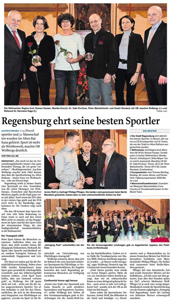 Bereits zum zehnten Mal übernahm Armin Wolf die Aufgabe, die besten Sportler und die besten Mannschaften der Stadt Regensburg zu ehren. Oberbürgermeister Joachim Wolbergs zeichnete die Athleten aus.