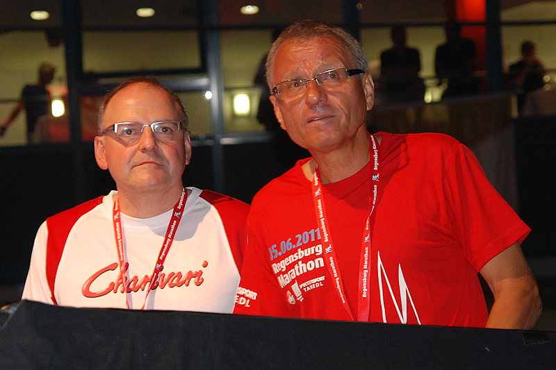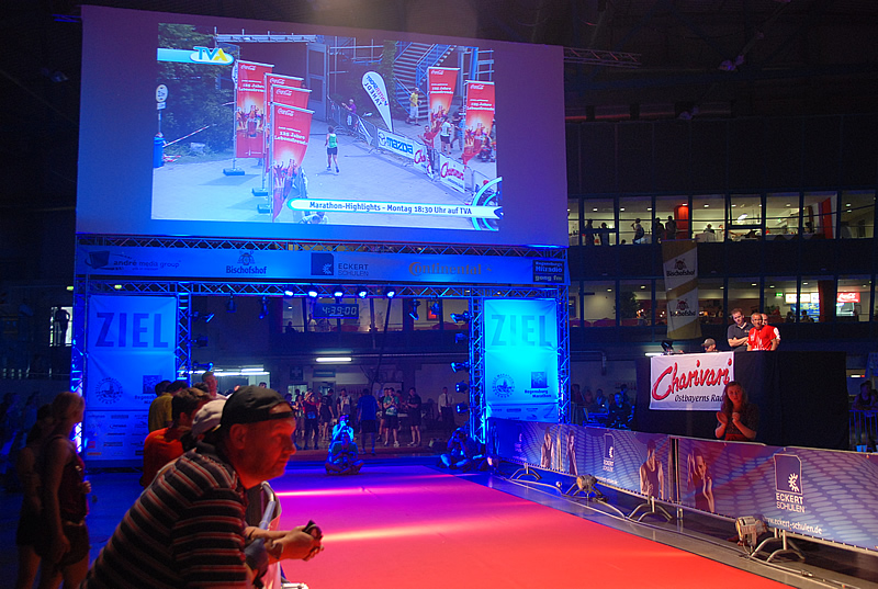 Foto: Thomas Harmsen Am augenscheinlichsten den Sportlern: Die letzten Meter bis zur Ziellinie werden nicht nur auf einer großen Videoleinwand übertragen, sondern sind wie eine Bühne gestaltet: mit rotem Teppich, viel Scheinwerferlicht und der bewährten Moderation von Armin Wolf und Norbert Lieske. Auch die geänderte Streckenführung mit Start und Ziel in der Donauarena statt wie bisher im Stadtwesten fand den Beifall der Sportler.