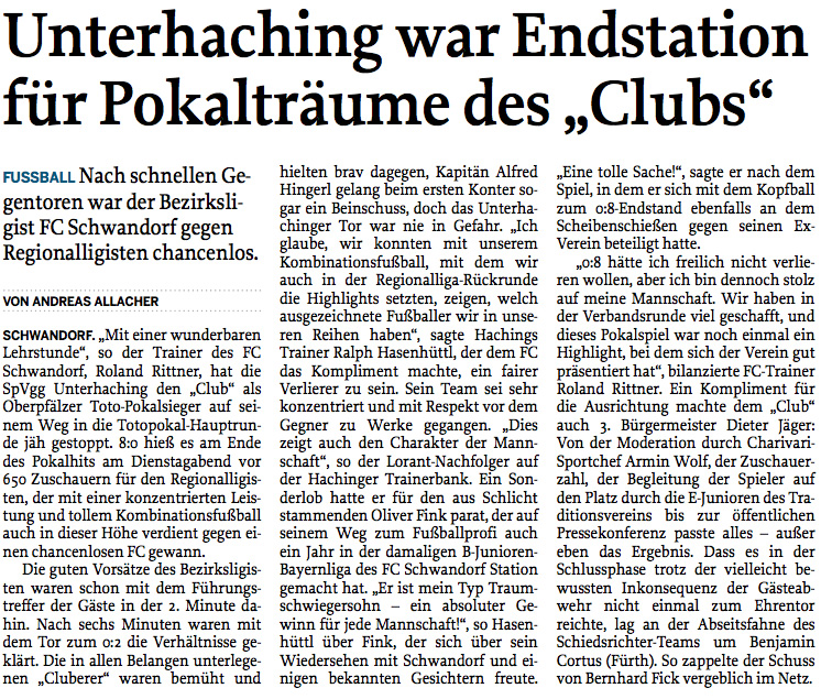 „Mit einer wunderbaren Lehrstunde“, so der Trainer des FC Schwandorf, Roland Rittner, hat die SpVgg Unterhaching den „Club“ als Oberpfälzer Toto-Pokalsieger auf seinem Weg in die Totopokal-Hauptrunde jäh gestoppt. 8:0 hieß es am Ende des Pokalhits am Dienstagabend (20. Mai 2008)vor 650 Zuschauern für den Regionalligisten, der mit einer konzentrierten Leistung und tollem Kombinationsfußball auch in dieser Höhe verdient gegen einen chancenlosen FC gewann.