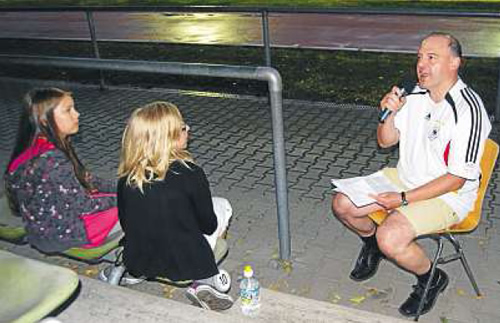 Foto: Mittelbayerische Zeitung So ähnlich erging es den 200 Besuchern der „Nacht der Worte“ an jedem der 13 Schauplätze. Literatur erleben war das Konzept, das einmal mehr voll aufging. Die Verknüpfung von Ort und Wort machte die Lesungen zu einem eindrucksvollen Erlebnis. Der besondere Reiz bestand in der Auswahl der Schauplätze, die vom Schockraum des Barbara-Krankenhauses über eine Eisküche bis hin zum Stadion reichte. Für einen Nachtspaziergang waren es außergewöhnliche Orte, die manchmal sogar tagsüber für die Öffentlichkeit schwer zugänglich sind.
