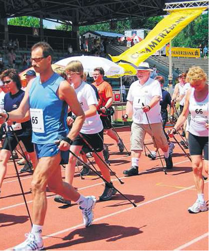 Foto: Mittelbayerische Zeitung Schwandorf (07.07.2008) Im Sepp-Simon-Stadion herrschten passend zum sommerlichen Wetter Heiterkeit und Ausgelassenheit, als sich gegen 14 Uhr die 80 Nordic Walker an der Startlinie aufstellten. Für sie fiel der erste Startschuss zum dritten Commerzbank Charity Stadtlauf.