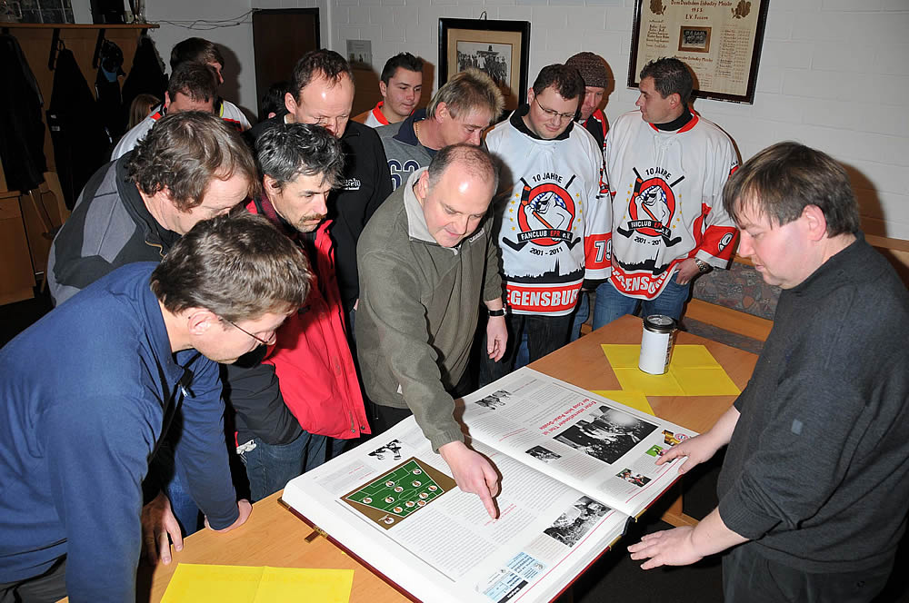 Vor dem Spiel des EV Regensburg in der Eishockey-Oberliga Süd beim EV Füssen (26.12.2012) wurde die Chronik in der Stadiongaststätte des EV Füssen ausgestellt. In Zusammenarbeit mit den Füssener Medienvertretern konnte ich die Ausstellung organisieren. Mein Dank gilt Werner Streidl, Heiko Köhntopp und Reiner Zenzs.