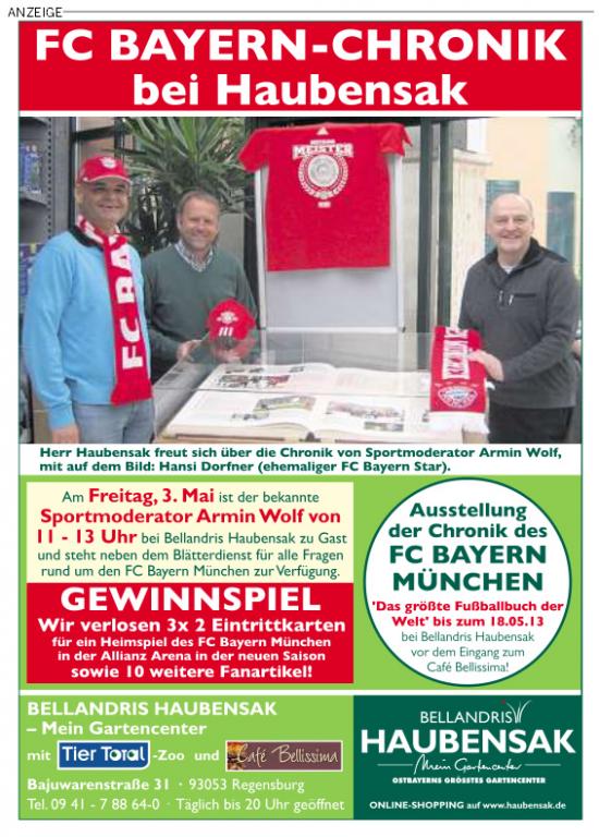Die Chronik des FC Bayern München steht noch bis zum 18. Mai bei Bellandris Haubensak in Regensburg in der Bajuwarenstraße.
