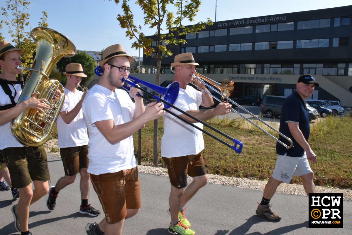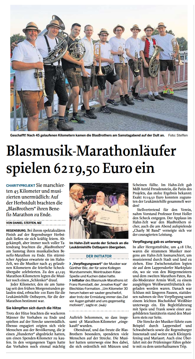 Gerne habe ich für eine ungewöhnliche Aktion gemeinsam mit MdB Astrid Freudenstein die Schirmherrschaft übernommen. Die "BlasBrothers" wollten marschierend und spielend einen Marathon absolvieren. Jeder Kilometer wurde verkauft. Das Geld ging an die Leukämiehilfe Ostbayern. Die Teilstrecke von Lappersdorf nach Tegernheim zum Baseballstadion bin ich mitmarschiert.