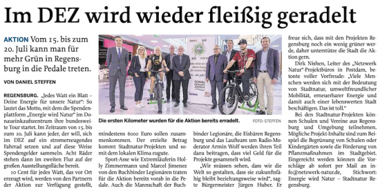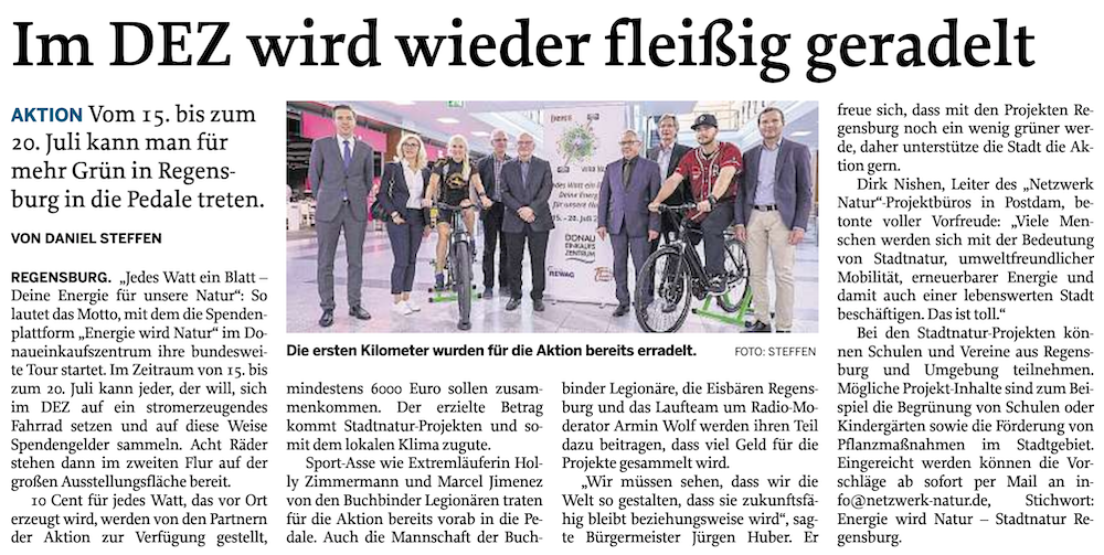 Mitte Juli wird es im Donaueinkaufszentrum eine ganz neue Radaktion geben. Armin Wolf, das Armin-Wolf-Laufteam, die Buchbinder Legionäre und die Eisbären Regensburg unterstützen. Die Radfahrleistung wird von der Rewag in Energie umgewandelt und mit Geld prämiert. Dieses Geld geht an Umweltprojekte in Regensburg.