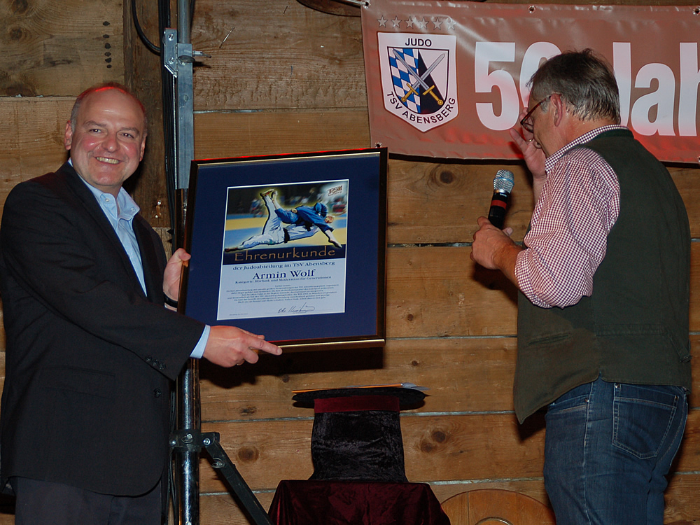 Im Rahmen einer großen Gala im Abensberger Weißbierstadl wurden Persönlichkeiten aus unterschiedlichsten Bereichen für Ihre Unterstützung des Abensberger Judosports ausgezeichnet. Armin Wolf erhielt dabei den Preis für Hörfunkbeiträge und Moderation "für Generationen". Die Ehrungen nahm "Mr. Judo Abensberg" Otto Kneitinger vor.