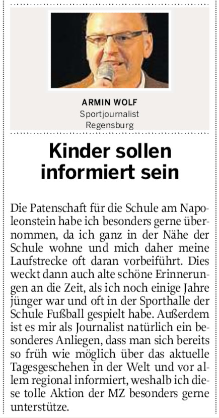 Gerne habe ich eine Zeitungspatenschaft übernommen. Ein Jahr lang bekommt deshalb die Napoleonstein-Schule in Regensburg die Mittelbayerische Zeitung kostenlos geliefert. Auf einer Sonderseite wurden allen Paten in der MZ vorgestellt. Mehr Infos über die Zeitungspatenschaft hier.