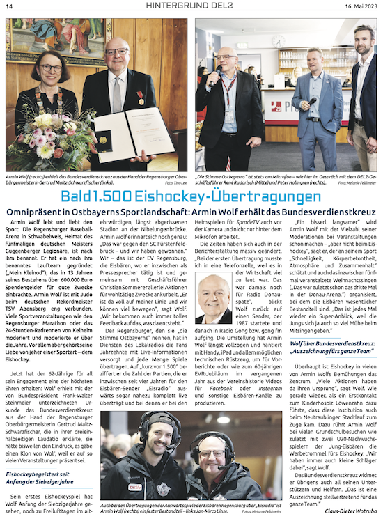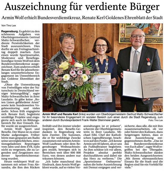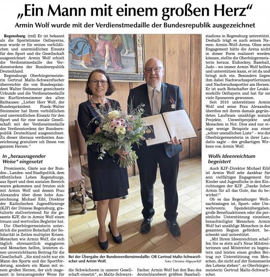 Für seinen jahrzehntelangen Einsatz für den Sport und für soziale Projekte hat Armin Wolf am 5. Mai die Verdienstmedaille des Verdienstordens der Bundesrepublik Deutschland erhalten. Regensburgs Oberbürgermeisterin Gertrud Maltz-Schwarzfischer übergab die Auszeichnung im Kurfürstenzimmer des Alten Rathauses in Regensburg.