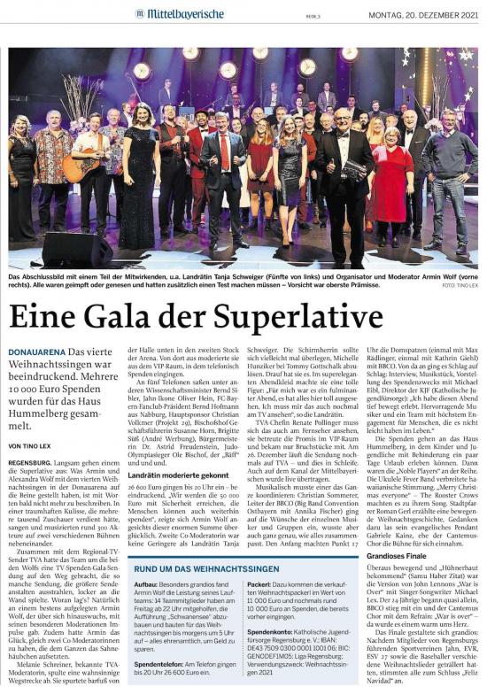 Insgesamt sind beim Regensburger Weihnachtssingen 75.000€ zusammengekommen. Wir bedanken uns bei allen Freunden, Spendern und Unterstützern - vor allem beim Armin Wolf Laufteam. Die 75.000€ gehen an das Projekt „Haus Hummelberg“ der Katholischen Jugendfürsorge der Diözese Regensburg.