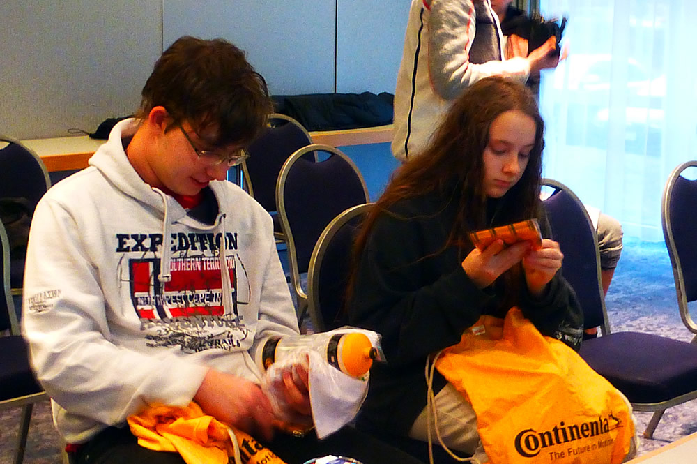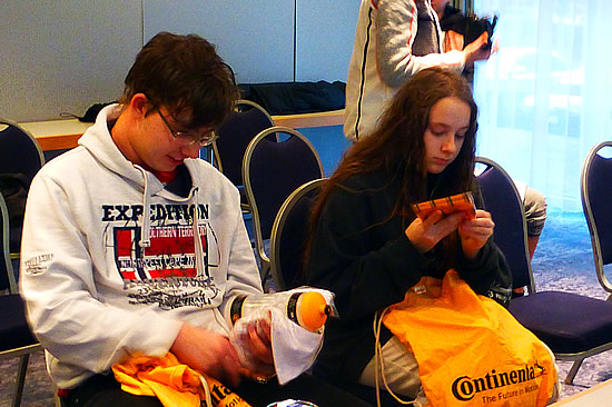 16:30: Chris Bach von Continental Regensburg übergibt Trinkflaschen, Trikots, Sportbeutel und für jeden ein Bandana.