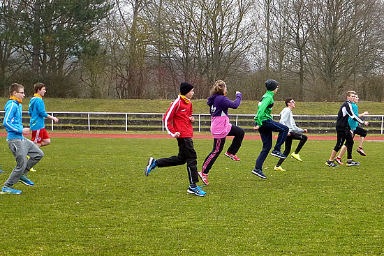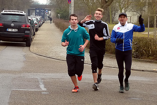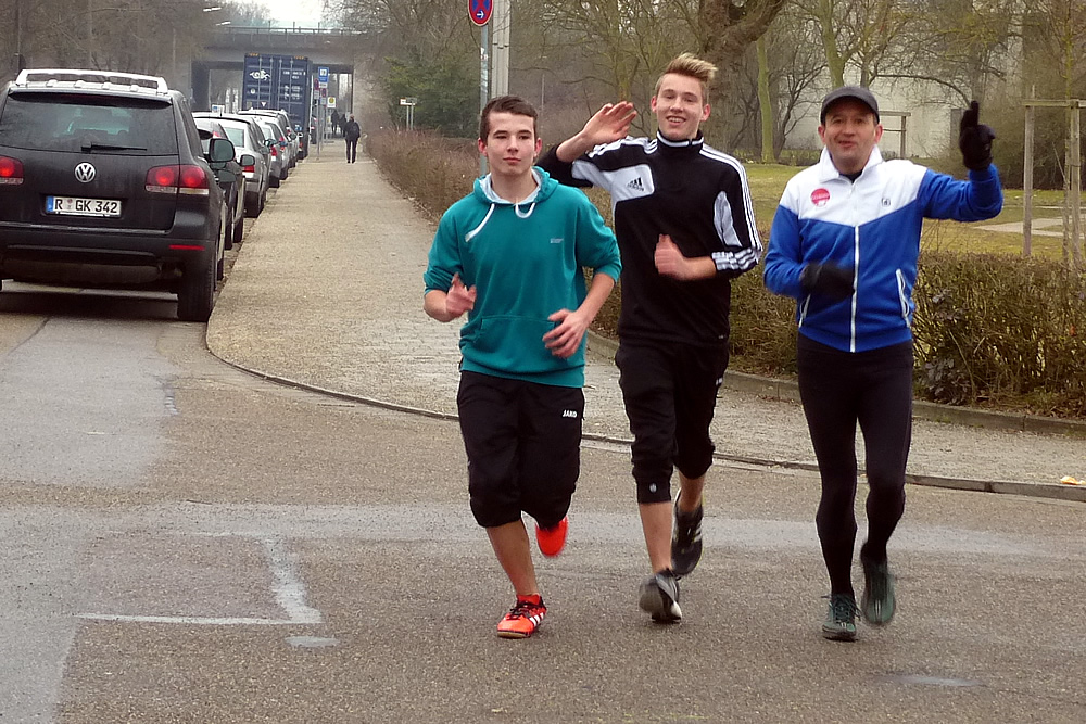 10:00 Uhr: Lauf-ABC und Lauftraining auf der Bezirkssportanlage am Weinweg. Eine kleine Gruppe machte sich vorab mit Ironman Armin Petz schon auf den Weg.