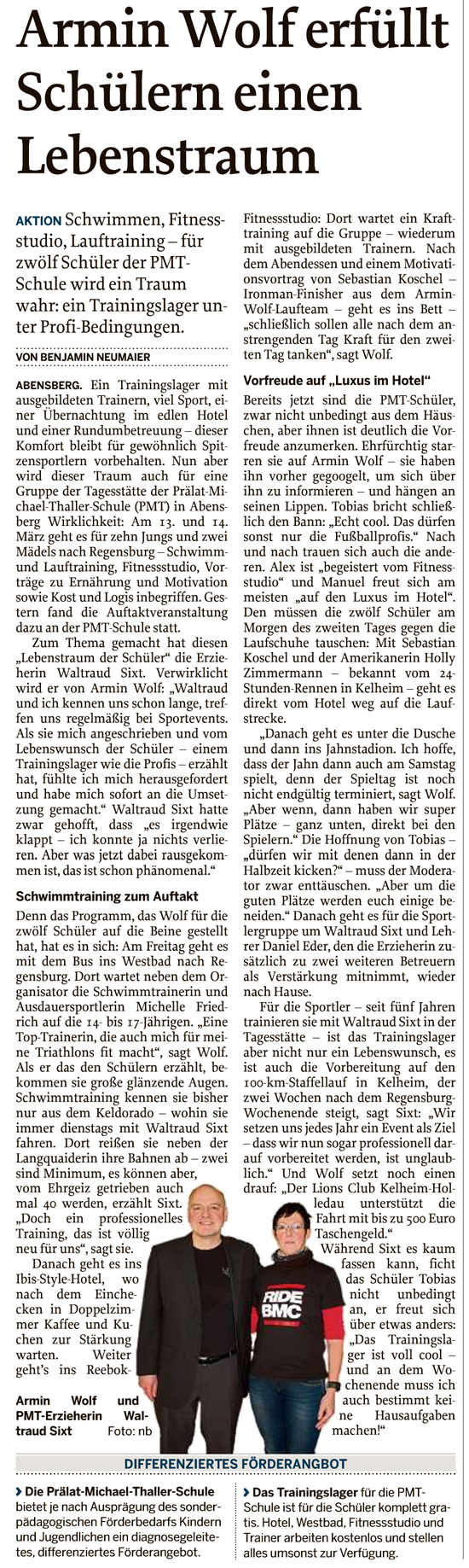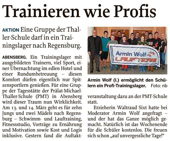 Einen Lebenstraum von Kindern erfüllen, wer will das nicht? Als die Anfrage von Waltraud Sixt von der Prälat-Michael-Thaller-Schule kam, ob es eine Möglichkeit gäbe, ein Trainingslager für Ihre Sportgruppe zu organisieren, waren wir begeistert. "Ihr würdet damit den Kindern einen Lebenstraum erfüllen". In der Schule werden Schüler mit besonderem Förderbedarf in Sprache und Lernverhalten sowie der sozialen und emotionalen Entwicklung unterrichtet.